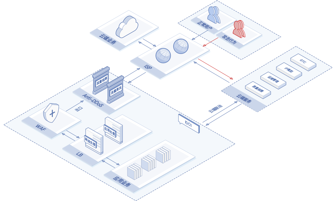 用户通过自建数据中心与公有云相结合的方式进行业务部署,具有高可靠、弹性扩展、安全防护的场景需求。此方案为NF1整体解决方案,数据中心使用NF1 ADC优化流量分发,并对应用攻击进行防护。DDoS安全防护组件,检测攻击流量超过本地防护阈值,扩展云端防护能力进行流量清洗与防护。