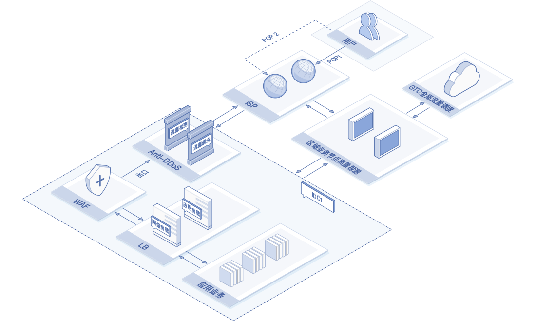 用户自建数据中心对外提供应用服务。数据中心存在多区域、多POP入口特点,对可靠性,稳定性,业务连续性要求较高。场景中ADC提供应用安全防护以及负载均衡能力,GTC服务实时监控POP状态,当发现流量入口异常,GSLB进行全局流量调度,保证业务连续性。
