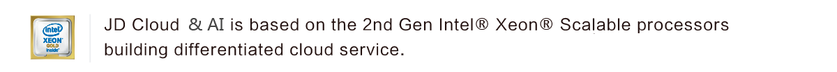 Compared to the last generation of JD Cloud & AI Virtual Machine, the workload speed of JD Cloud & AI’s Generation III Virtual Machine has been significantly improved by the adoption of Generation II Intel®Xeon®Gold Processor. With higher vCPU and memory specification and configuration of the latest Virtual Machines, JD Cloud & AI has made in-depth optimization in virtualization, network and scheduling and others, which greatly improved its service performance and better supported the computationally intensive scenarios, such as scientific modeling, gene computing, data mining and analysis, high performance computing, etc.